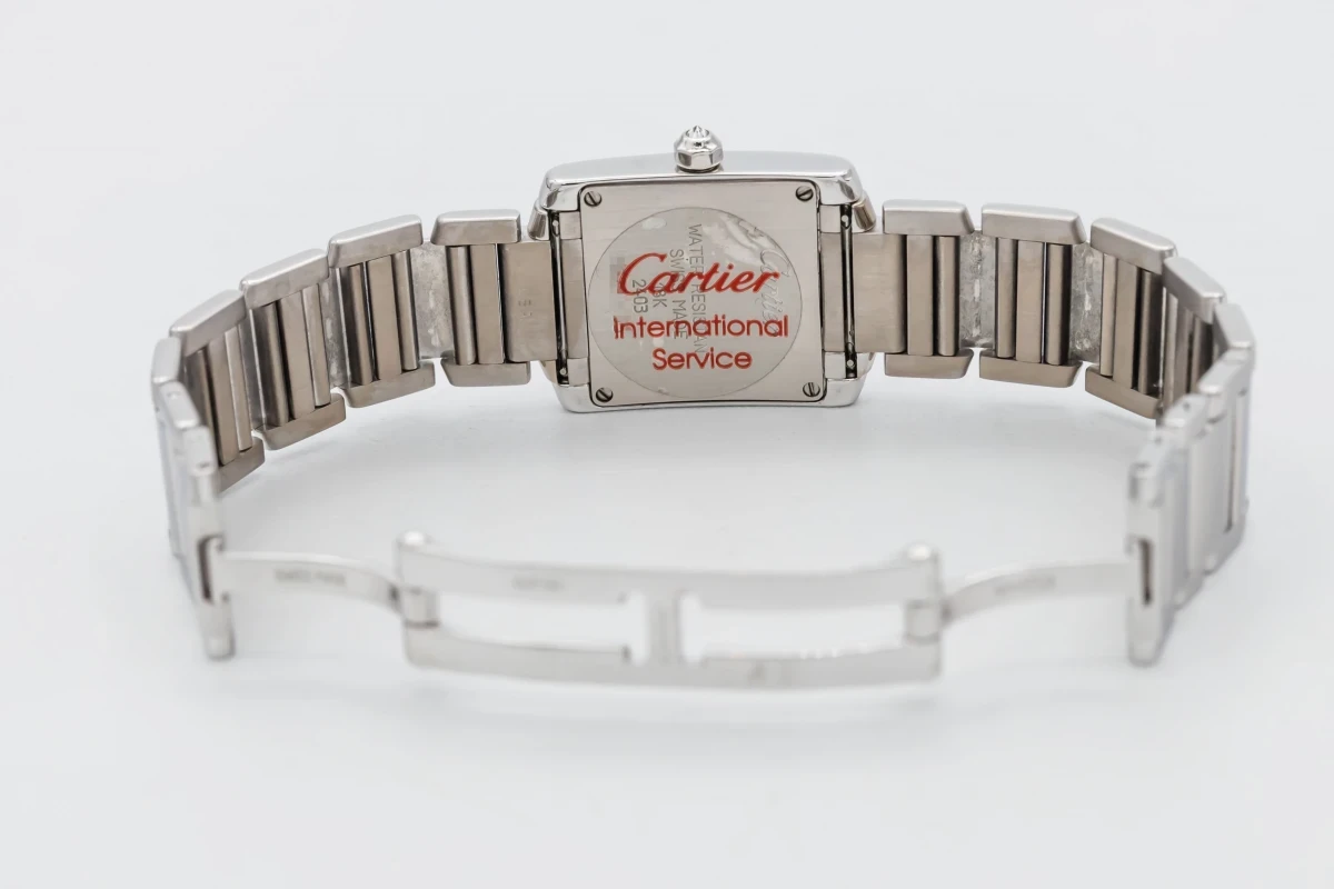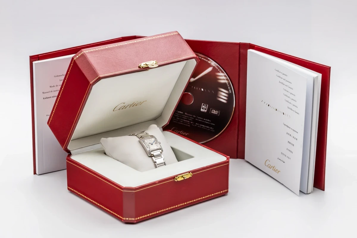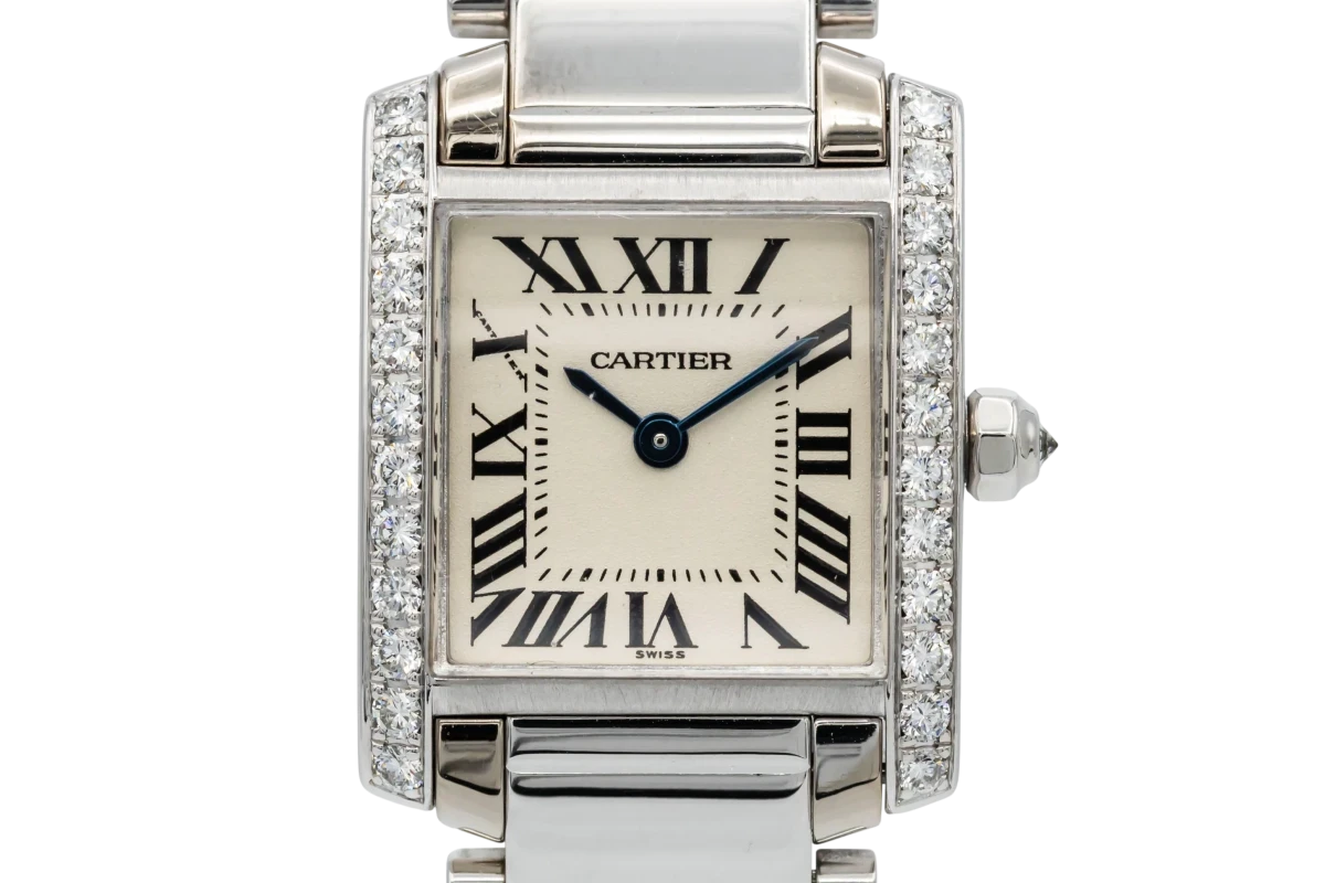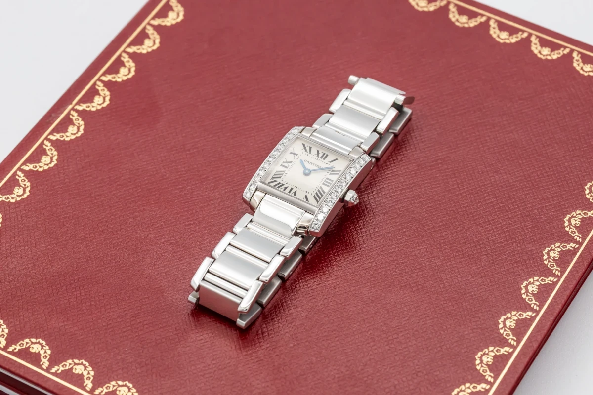 This 2010 Cartier Tank Franciase 20mm features a silver dial with roman numeral markers. It also features a 18ct white gold bracelet and a factory diamond bezel.